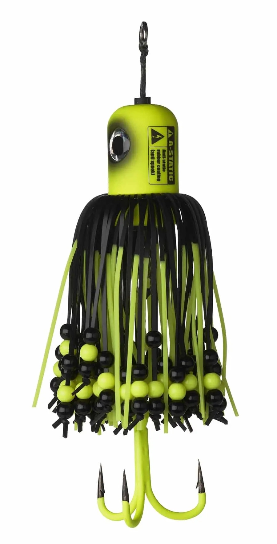 De A-STATIC 16cm 2/0 100g FLUO YELLOW UV versie van de originele MADCAT Clonk Teaser met een rubberen kop en dreg om het elektromagnetische veld te minimaliseren dat meervallen kan afschrikken. Let op: De rubberen coating kan tijdens het gebruik afslijten.