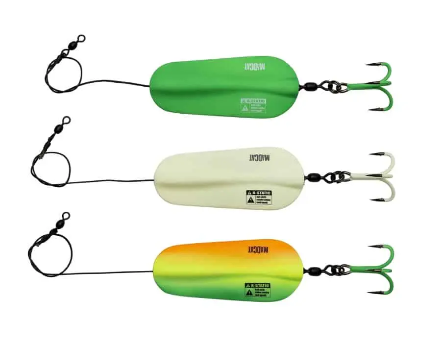 De MADCAT A-STATIC INLINE SPOON 3/0 125G SINKING heeft een zware inline meerval richtingaanwijzer voor het werpen over lange afstanden. Het voordeel van de inline constructie is dat de meerval de flitser niet als hefboom kan gebruiken om van het aas af te komen, omdat de flitser dan langs de lijn omhoog schuift. Drielingmaat: 3/0. A-STATIC, wat betekent: met rubber bekleed om het elektrische veld dat meervallen kan afschrikken te minimaliseren. Let op: De rubberen coating kan door gebruik afslijten.
