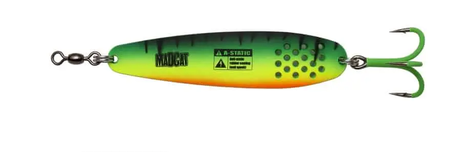 De MADCAT A-STATIC TURBINE SPOON 90G zijn 90gr meervallepels met gaten voor extra turbulentie. Door de slanke vorm ideaal voor snel stromend water. Wordt geleverd met een ongelooflijk sterke en scherpe dreg, maat: 3/0. A-STATIC, wat betekent: met rubber bekleed, om het elektrische veld dat meervallen afschrikt te minimaliseren. Let op: de rubberen coating kan tijdens gebruik afslijten.