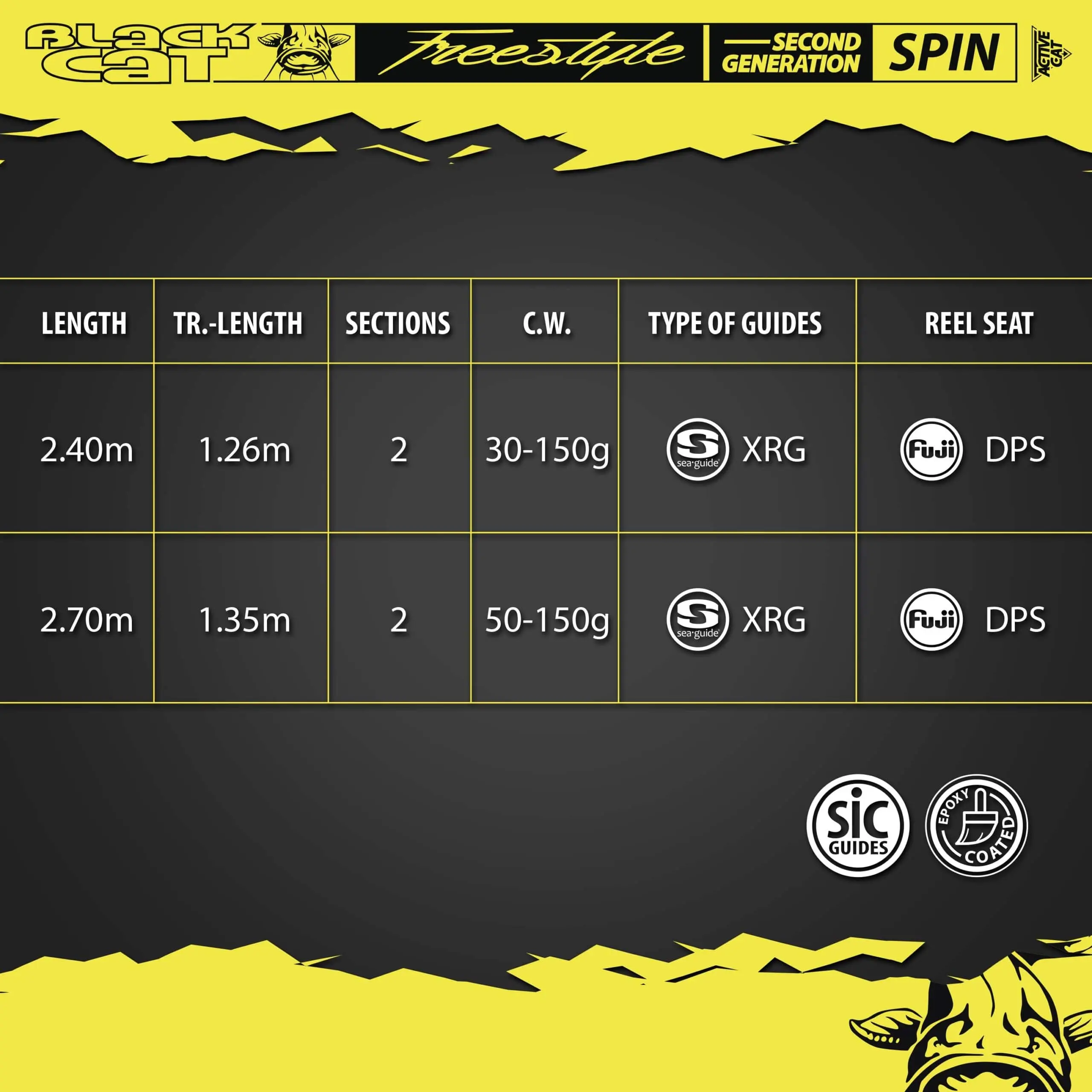 De Black Cat Freestyle Spin second generation is een nogal in het oog springende meerval hengel, geschikt voor het kunstaasvissen vanuit de boot, of langs oevers van rivieren. zijn bijzonder sterke body in combinatie met gevoelige top, maken de Black Cat Freestyle Spin uitermate geschikt voor het vissen op meerval met middel groot kunstaas. deze hengel is 240 centimeter en heeft een werpgewicht van 30-150 gram