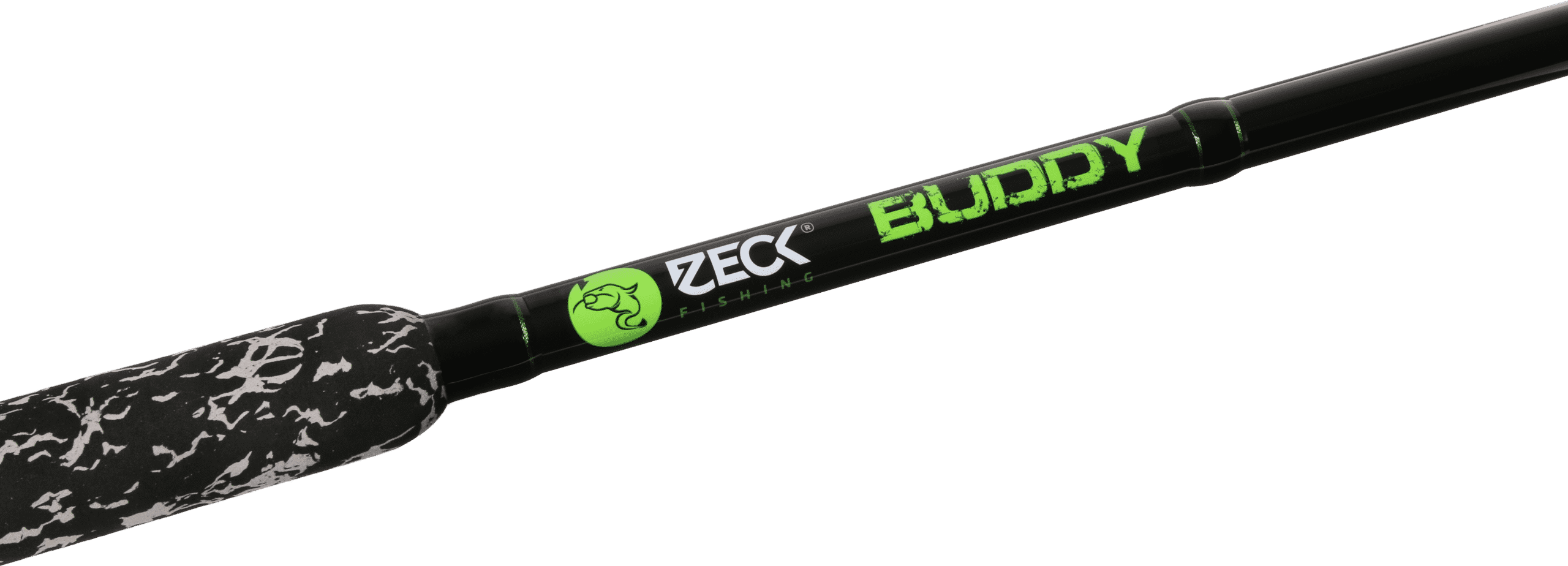 Bij de Zeck Buddy was het niet eenvoudig om een hengel te ontwerpen die dezelfde kwaliteitsnorm heeft als alle andere Zeck meerval hengels en tegelijkertijd goedkoper moet zijn. Zeck wilde niet op de componenten besparen. Daarom zijn de Sea-Guide-ringen, de Fuji-reelhouder en cone, evenals handvat, wikkelingen, lak etc. precies hetzelfde als bij de Zeck Pro-Cat serie .Maar waar kan Zeck nu op besparen bij deze hengel om de prijs laag te houden? Het idee wat Zeck uiteindelijk kon implementeren was het ontwikkelen van een moderne blank uit glasvezel. Omdat deze grondstof aanzienlijk goedkoper is dan koolstofvezel kon Zeck de Buddy voor een prijs in de handel brengen die ook interessant is voor beginners, jongeren of vissers die niet meer dan 100 euro willen uitgeven voor een meerval hengel. Na een lange testfase is het ons duidelijk: als je geen afstandhengel zoekt om af te spannen is de Buddy een perfecte oplossing als betaalbare hengel. De actie met 300 gram werpgewicht is vergelijkbaar als de Zeck Short en Soft hengel maar door zijn glasvezel blank is deze hengel een stuk parabolischer met iets minder body. Zelfs grote vissen kunnen eenvoudig worden gedrild, terwijl kleinere exemplaren voor veel drilplezier zorgen. De Buddy weegt slechts 10 gram meer dan onze Pro-Cat van 3,00 meter en benadrukt verder dat de blank geen gelijkenis kent met de oudere generaties glasvezel blanks. De Zeck Pro-Cat is afgebouwd met een Fuji DPS H/24 molenhouder en 9+1 Seaguide geleideogen met een startoog wat een diameter van 30mm heeft. De hengel is even gedeeld en heeft een transportlengte van 150cm. De achterkant van het handvat heeft een lengte van 42cm. De hengel is perfect allround toe te passen vooral bij de visserij met het afspannen van de meerval montages, dobber vissen, boeien vissen en het vissen met grondmontages op afstanden tot 150 meter. Deze hengel is afgewerkt in een zwarte coating en een fraaie camouflage handvat